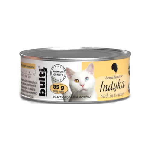 BULTI – pasztet bogaty w indyka to wyjątkowa mokra karma dla kota, stworzona z myślą o najbardziej wymagających kocich smakoszach. Każda puszka to pełnoporcjowy posiłek o wysokiej zawartości mięsa (aż 65%), w tym delikatnego indyka, soczystego kurczaka i aromatycznej wołowiny.