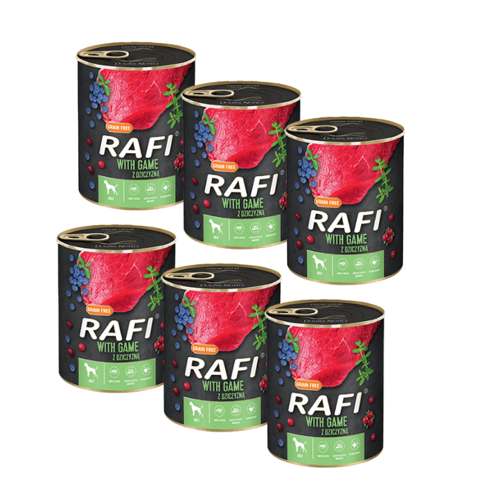 Karmy Rafi to pełnoporcjowa propozycja żywieniowa dla dorosłych psów wszystkich ras. Wyróżnia je zawartość białka bogatego w aminokwasy takie jak fenyloalanina i cystyna. Karmy Rafi to aż sześć wariantów skomponowanych z mięs bogatych w wartości odżywcze i minerały, w tym na przykład mięso przepiórki, która zawiera tłuszcze będące źródłem wielonienasyconych kwasów tłuszczowych, które wpływają na pracę organizmu. Mięso wołowe jest cennym źródłem lizyny i histydyny, a mięso z jagnięciny dostarcza do organizmu cennych witamin z grupy B. W składzie karmy znalazły się również owoce, takie jak borówka amerykańska i żurawina, które wykazują silne właściwości przeciwutleniające i przeciwzapalne. Tymianek, który również znalazł swoje miejsce w karmie stymuluje wydzielanie soków trawiennych, a także wpływa korzystnie na smakowitość posiłku. W karmie użyty został również olej lniany, który jest doskonałym źródłem kwasów tłuszczowych n-3 oraz n-6, witaminy E, a także związków biologicznie czynnych, które mają właściwości przeciwzapalnych, czy cennych fitosteroli, które mają duże znaczenie dla funkcjonowania przewodu pokarmowego.