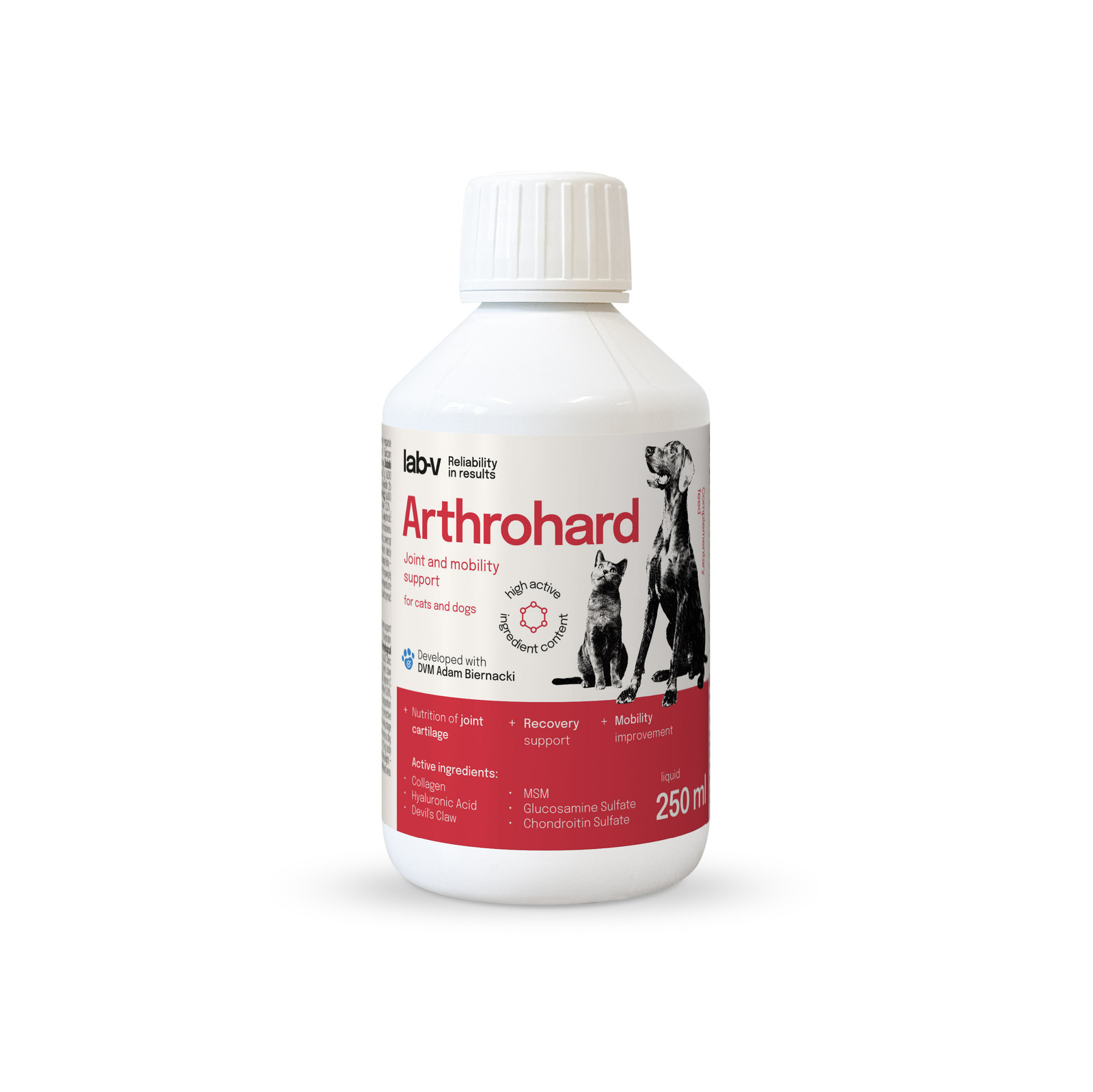 Arthrohard to preparat przeznaczony do wsparcia psich i kocich stawów. Ten łatwo przyswajalny preparat w formie syropu został stworzony z myślą o zwierzętach zarówno młodych, w intensywnej fazie wzrostu, jak i starszych, dla których wsparcie to jest niezbędne dla komfortowego życia. W skład Arthrohard wchodzi między innymi siarczan glukozaminy, siarczan chondroityny, kwas hialuronowy i czarci pazur. Taki dobór składników zapewnia kompleksowe wsparcie stawów, zarówno profilaktycznie, jak i podczas występujących schorzeń. Ta unikalna receptura pozwala na zastosowanie możliwie największego stężenia składników aktywnych, co pozwala na szybkie działanie i skuteczną regenerację. Preparat został opracowany we współpracy z wykwalifikowanymi lekarzami weterynarii i może być podawany bezpośrednio do pyszczka lub wymieszany z karmą.