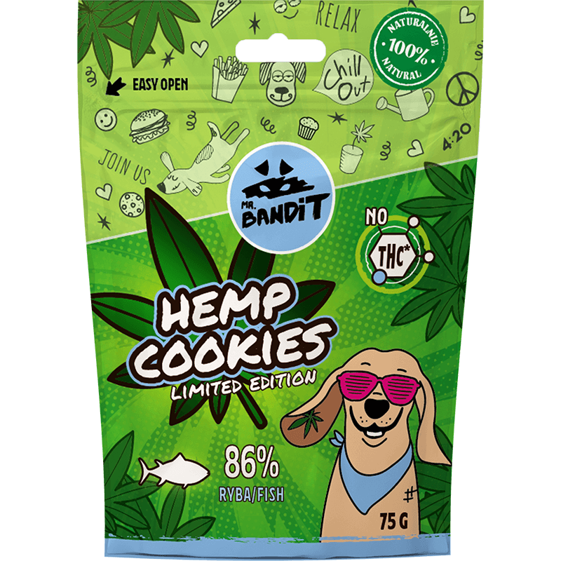 Przysmaki Mr. Bandit Hemp Cookies w swoim składzie zawierają polską odmianę konopi. Charakteryzuje się ona wysoką zawartością związków kannabidiolowych, które działają kojąco, wprowadzając zwierzaka w stan błogiego relaksu, jednocześnie go nie otępiając. W składzie przysmaków znalazł się także olej z łososia, który jest niezaprzeczalnie doskonałym źródłem cennych, nienasyconych kwasów tłuszczowych omega-3 i omega-6, znanych ze swojego szerokiego działania na organizm. To właśnie te kwasy oddziałują między innymi na kondycję skóry i sierści naszego zwierzaka, pracę jego układu odpornościowego oraz nerwowego. Dlatego tak ważne jest, by wzbogacać w nie dietę pupila. Zawartość THC w przysmakach wynosi poniżej 0,01%, dzięki czemu bez obaw możemy podawać je naszemu pupilowi.