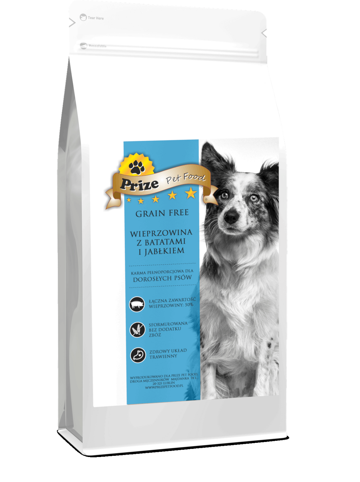- Prize Grain Free Wieprzowina z Batatami i Jabłkiem to hypoalergiczna karma, bez zbóż z apetycznym mięsem wieprzowym.