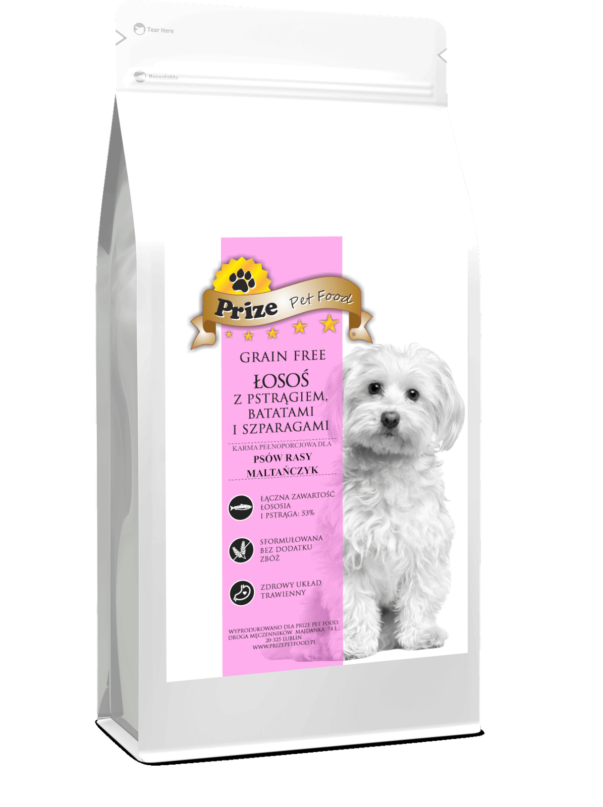 Prize Maltese Adult - monobiałkowa oraz bezzbożowa karma dedykowana dla dorosłych psów rasy Maltańczyk. Do wyboru jagnięcina lub łosoś. Gęsta, śnieżnobiała i aksamitna w dotyku sierść, płynny chód, wspaniały charakter i ponadprzeciętna inteligencja – oto jedyna akceptowalna definicja piesków rasy Maltańczyk! Większość reprezentantów tej antycznej rasy cechuje łagodność, dlatego są to najlepsi towarzysze jakich tylko można sobie wymarzyć. Oprócz anielskiego wyglądu i usposobienia, kolejną cechą maltańczyków jest ruchliwość i nieodparta chęć do eksplorowania terenów. Dlatego więc oferujemy twojemu małemu przyjacielowi wysokoenergetyczne karmy Prize Maltese Adult.