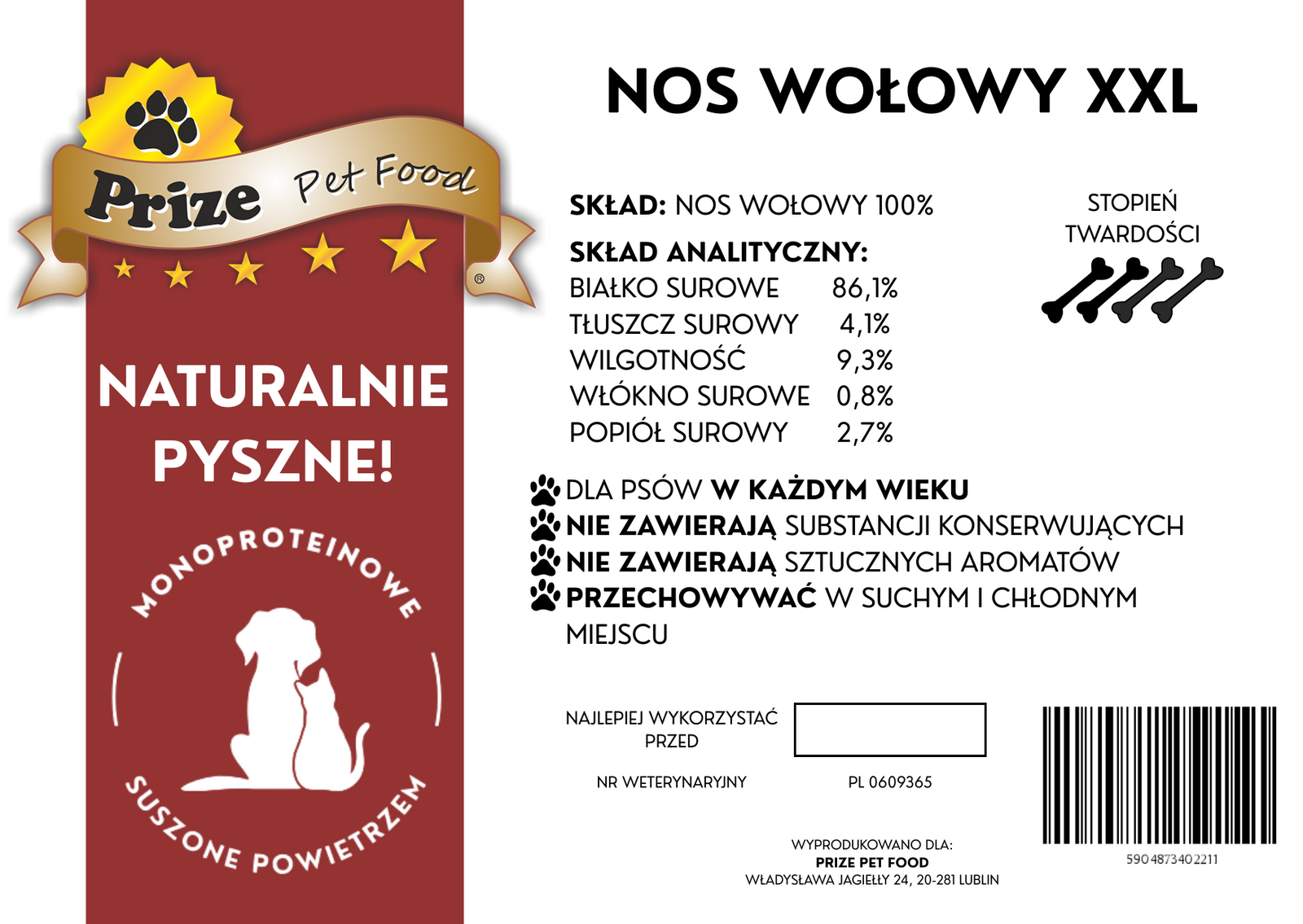 - Nos wołowy XXL to wyjątkowo aromatyczny i długo suszony gryzak dla psów, które uwielbiają intensywny zapach i długie żucie.
