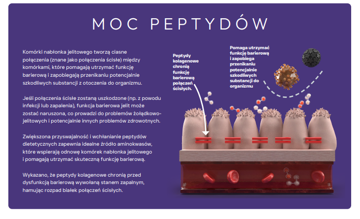 Zawartość peptydów kolagenowych wspiera integralność połączeń między komórkami jelit, zapobiegając przenikaniu szkodliwych substancji. Postbiotyki natomiast: