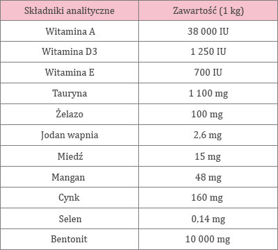 Białko 40%, oleje i tłuszcze 20%, sole mineralne 8.5%, włókno surowe 2%, wapń 1.5%, fosfor 1.3%, sód 0.54%, potas 0.71%