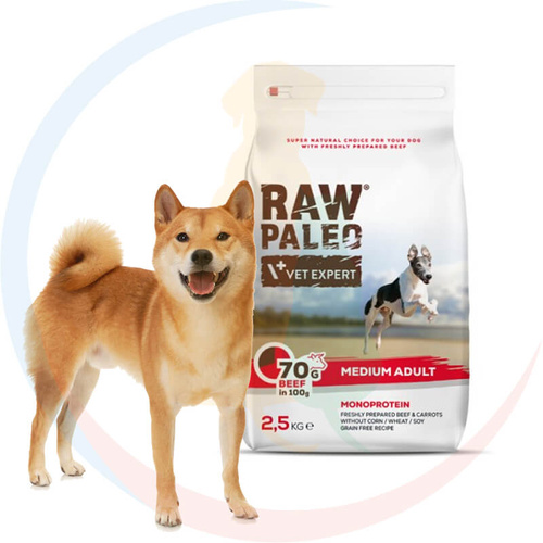 - RAW PALEO ADULT MEDIUM BEEF - sucha karma z wołowiną dla dorosłych psów ras średnich. Wysokomięsna, monoproteinowa, bezzbożowa i supernaturalna karma sucha dla Twojego psa.