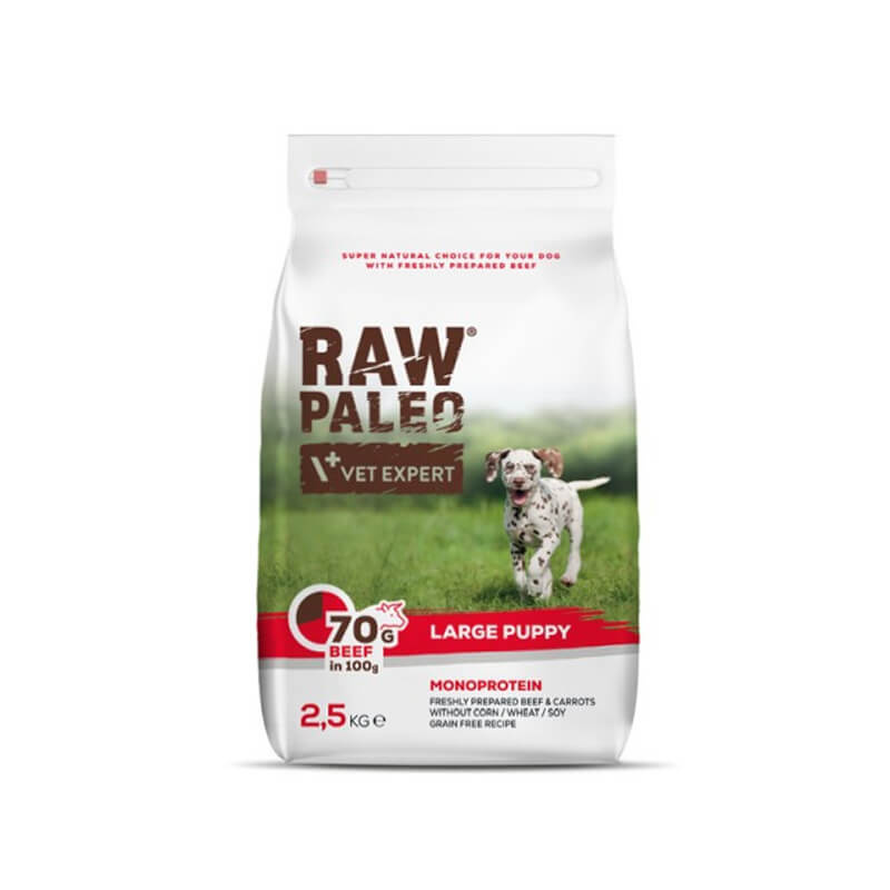 - RAW PALEO PUPPY LARGE BEEF - sucha karma z wołowiną dla szczeniąt ras dużych. Wysokomięsna, monoproteinowa, bezzbożowa i supernaturalna karma sucha dla Twojego psa.