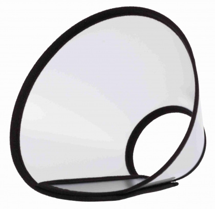 Kołnierz weterynaryjny dostępny jest w kilku rozmiarach – warto dokładnie zmierzyć obwód szyi psa by odpowiednio go dopasować. Wykonany jest z plastiku – niezbyt grubego, by nie był ciężki, ale takiego, który zapewni ochronę i ograniczy zwierzęciu możliwość wylizywania ran pooperacyjnych i tych powstałych przez alergie czy infekcje. Kołnierz ogranicza wylizywanie sierści i skóry, nie pozwala skubać szwów i zdejmować bandaży. Przezroczystość plastiku zapewnia dobrą orientację w terenie i widoczność, to ważne ze względu na poczucie komfortu i bezpieczeństwa psa. Brzegi obrębione materiałem dają gwarancję, że pies nie podrapie się i nie porani szyi. Wykończono materiałem również brzeg zewnętrzny, dzięki czemu pies nie będzie zadzierał kołnierzem mebli czy ścian. To proste rozwiązanie doskonale sprawdza się u psów znajdujących się w okresie rekonwalescencji. Ochraniacz weterynaryjny pozwala wygodnie siedzieć, leżeć i chodzić. Z pewnością samo noszenie kołnierza będzie powodowało dyskomfort, jednak materiałowe wykończenia z pewnością zabezpieczą zarówno psa jak i otoczenie przed podrapaniem. Zapinany jest na mocny, wygodny rzep.